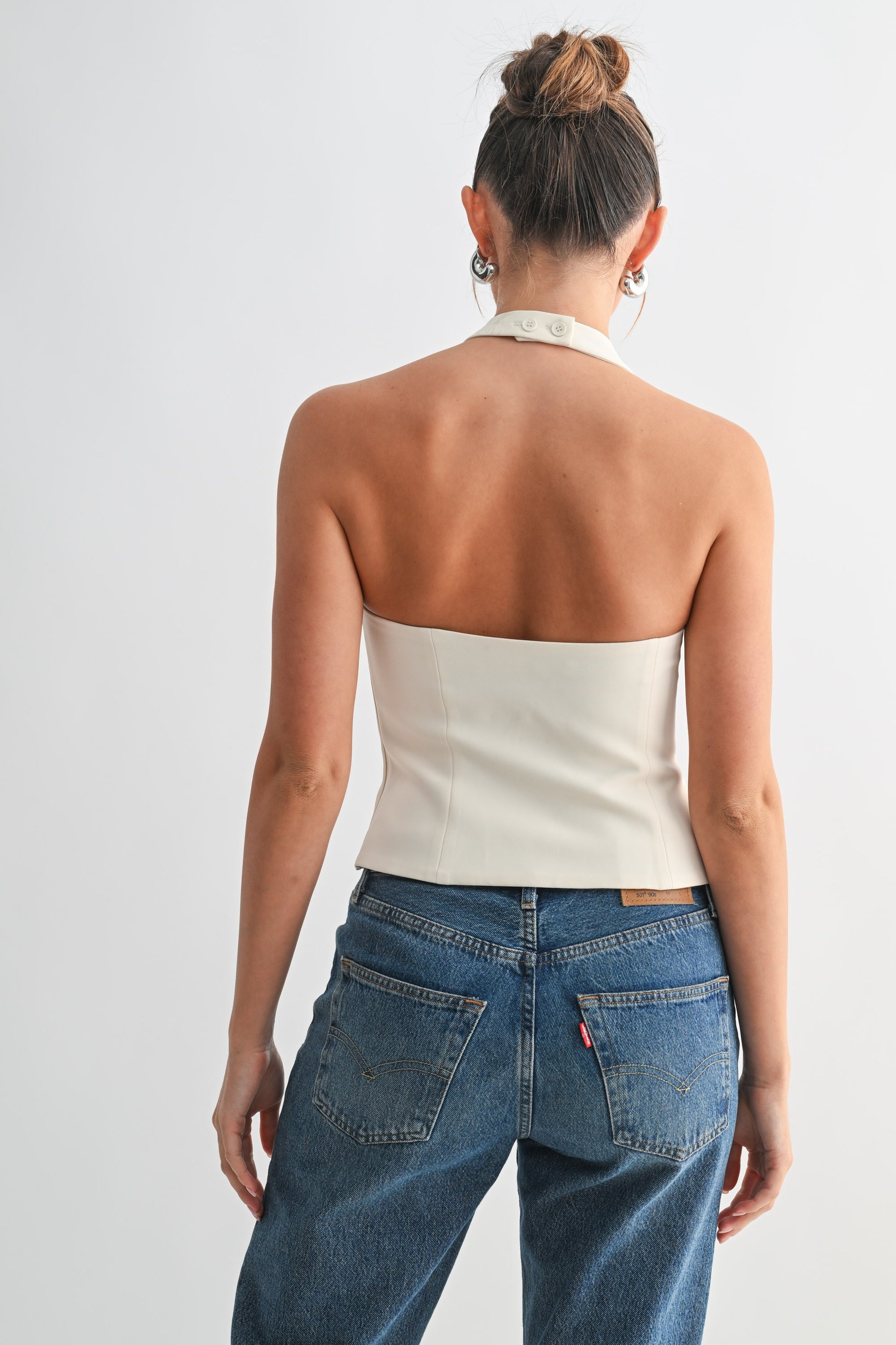 The Antonella Top features a sculpted halter neckline with a daring plunge and structured fit that accentuates the silhouette. Perfectly tailored to elevate any look — from casual denim to sleek evening wear.